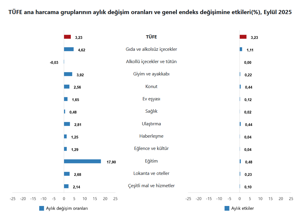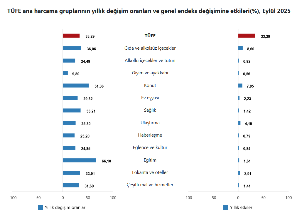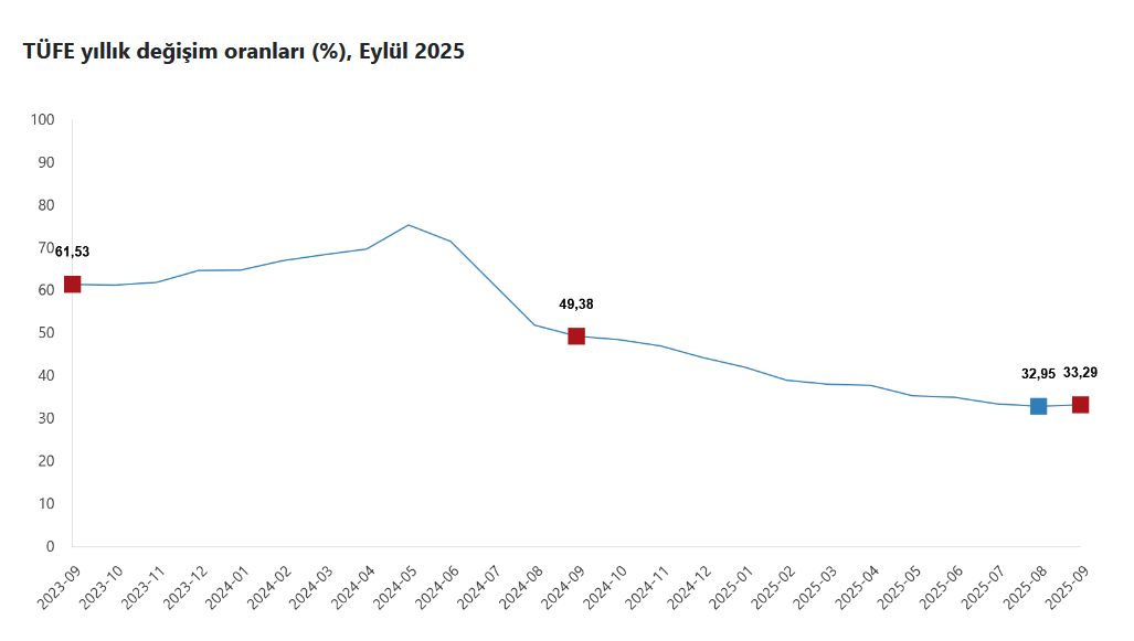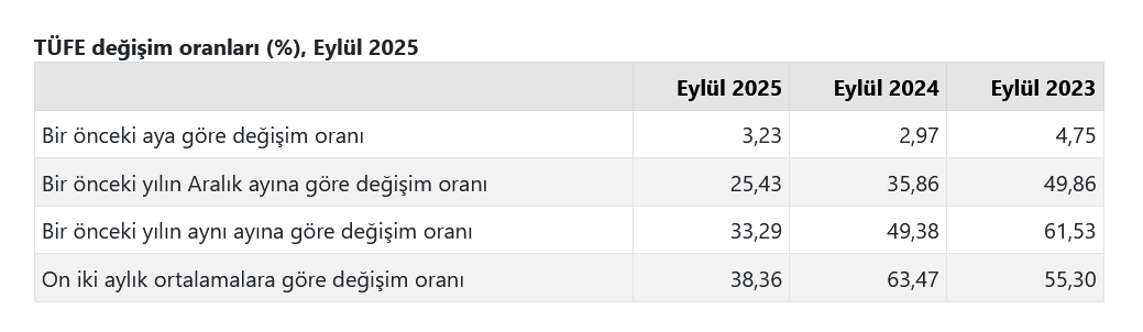 (Ayrıntılarla yenilendi) Türkiye İstatistik Kurumu (TÜİK) verilerine göre, TÜFE'deki (2003=100) değişim 2025 yılı Eylül ayında bir önceki aya göre yüzde 3,23 artış, bir önceki yılın Aralık ayına göre yüzde 25,43 artış, bir önceki yılın aynı ayına göre yüzde 33,29 artış ve on iki aylık ortalamalara göre yüzde 38,36 artış olarak gerçekleşti.