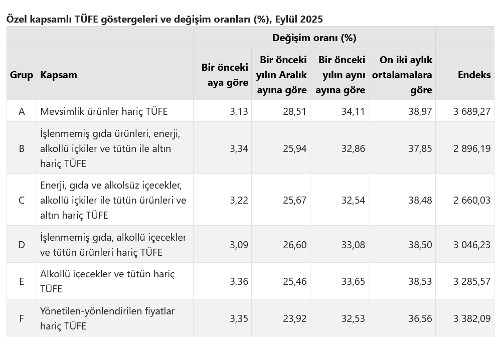 İşlenmemiş gıda ürünleri, enerji, alkollü içkiler ve tütün ile altın hariç TÜFE'deki değişim, 2025 yılı Eylül ayında bir önceki aya göre yüzde 3,34 artış, bir önceki yılın Aralık ayına göre yüzde 25,94 artış, bir önceki yılın aynı ayına göre yüzde 32,86 artış ve on iki aylık ortalamalara göre yüzde 37,85 artış olarak gerçekleşti.